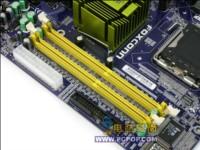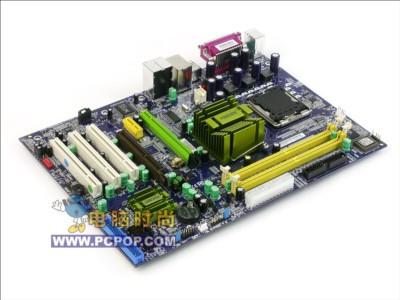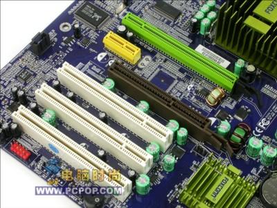 中间的绿色散热片下面是915PL北桥芯片,虽然可以支持DDR或者DDRII,但此款主板为了能够提供更好的性价比已将DDR2插槽省略,支持双通道DDR400内存,内存最大可以支持到2GB。