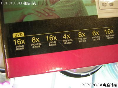 从包装上,我们可以清楚地看到,在去掉了用处不大的DVD-RAM支持后,在DVD刻录性能上有了明显提升,加入了4×DVD-R DL,并且DVD+R DL业升级为6×,其他的性能并没有变动。