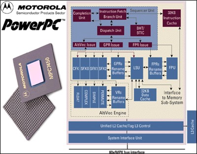 1999年9月,一个我们应当永远记住的日子:苹果正式发布PowerPC G4。这款机器所使用的处理器在Motorola的产品代号为PowerPC 7400。它的出现可以说是改变了个人电脑的概念,每秒10亿次的运算速度让普通用户感受到“超级计算机”的威力。由于其运算速度过快,因此在当时是不准向中国发售的。PowerPC 7400的设计速度为每秒14亿次,最高为30亿次。PowerPC 7400是在PowerPC G3的基础上开发的,它最初的设计理念是大幅度提高多媒体和多处理器的处理速度。而且PowerPC 7400也可以说是第一个打破摩尔定律的处理器,它在18个月里速度提升了10%。