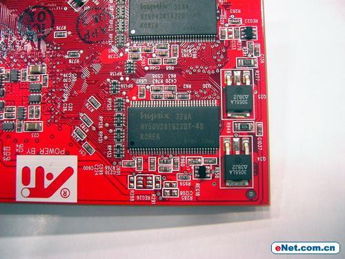 镭姬杀手9200SE的显存也选用了大厂产品,4颗TSOP封装的现代4ns DDR颗粒提供了64 bit/64M显存容量,据称可以稳定工作在200/400MHz频率下。