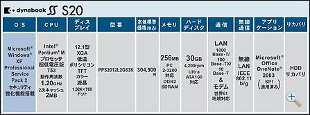 Dynabook SS S20的配置为目前的主流配置,采用Intel Pentium-M 753(1.2GHz 2MB L2 超低电压版),256MB PC3200内存和30G 4200rpm ATA100的硬盘。搭载的液晶屏幕为12.1寸XGA,分辨率为1024X768。从官方公布的数据来看,这款笔记本相对于SX属于商务机型,配置一般主要面对办公应用,更详细的内容可以点击以下图片察看官方数据。