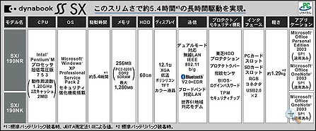 Dynabook SS SX分为NR和NK两种型号,基本配置为Intel Pentium-M 753处理器(1.2GHz 2MB L2 超低电压版),芯片组英特尔915GMS,内存依旧是256MB DDR2-400,不过硬盘则采用60G大容量硬盘。搭载的液晶屏幕为12.1寸XGA,分辨率为1024X768,整体重量为1.29公斤。