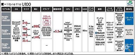 Libretoo U100系列详细可分为三个型号,可参见下图表格。在如此轻便的机身中容纳的是Intel Pentium-M 733 (1.1GHz 2MB L2 超低电压版)处理器,256MB DDR-333内存,60GB硬盘,7.2英寸分辨率为1280X768,最终让电池能够维持5.3小时之久。