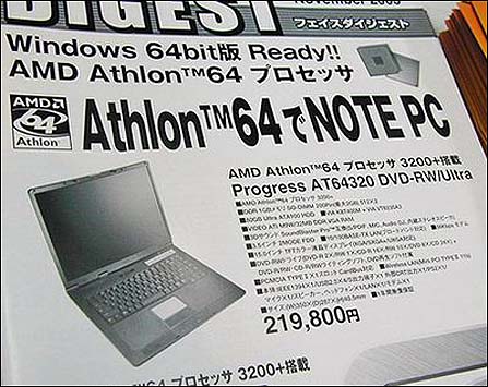 2003年11月,全球的第一款64位处理器的笔记本在日本上市。这款笔记本配备了Athlon 64 3200+,512M DDR内存,64G硬盘,康宝光驱(可选),并搭配了15英寸SXGA液晶显示屏。另外使用的是威盛Apollo K8T400M芯片组,ATi笔记本专用显卡M9C(64MB显存)。外形尺寸350×287x40.5mm,重3.18公斤,电池最久可使用2.5小时。 虽然它已经存在了移动PC的味道,然而它却首次向世人展现了64位持利器笔记本的动人魅力。