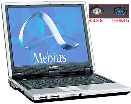 2003年9月,Sharp发布了世界上第一款可以显示3D图像而不需要3D眼镜的笔记本Mebius PC-RD3D。通过“Parallax Barrier”技术,在3D模式下他将产生左右眼不同的效果从而达到立体效果。这款笔记本的配置在当时也相当的高,不过并非迅驰平台,采用Mobile P4 2.8G处理器,512MB内存,60GB硬盘Geforce4 440Go显卡以及DVD光驱,LCD为15寸XGA(1024 X 768)。整体重量为4.6公斤,怎么说都是庞然大物。它的推出从另一个角度来说,将笔记本的视觉体验上升到了从未有的体验。遗憾的是,它的推出并没有受到市场的肯定。
