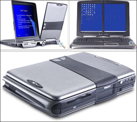 2002年7月,Xentex FLIP-PAD VOYAGER对笔记本电脑的新尝试,折叠笔记本第一出现在世人的面前。这款笔记本的屏幕被分割成了两个部分,每部分都为13.3寸。最神奇的莫过于它可以通过折叠将笔记本的面积压缩为原来的1/4。尽管这个笔记本的推出并未受到市场的肯定,但我们发现,笔记的设计开始走向多元化。