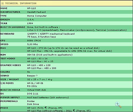 1984年5月,惠普公司发布了HP-110膝上型计算机。这款计算机首次向世人展现了在便携性能良好的膝上型计算机也可以具有台式机的优秀性能。这款计算机采用的处理器为Harris 80C86 (5.33MHz),272K内存,采用的显示器为480 X 128分辨率的单色液晶显示器。这时候的这款计算机已经内置了型号为300的调制解调器。 操作系统则采用了ROM固化形式储存,版本为DOS 2.11。