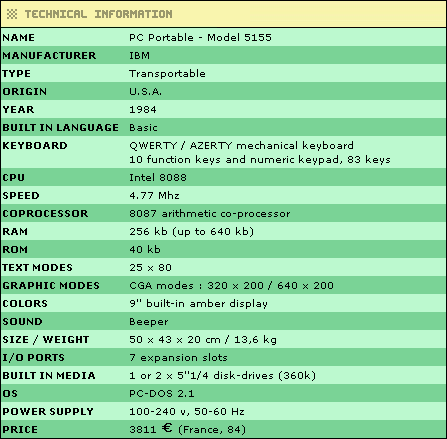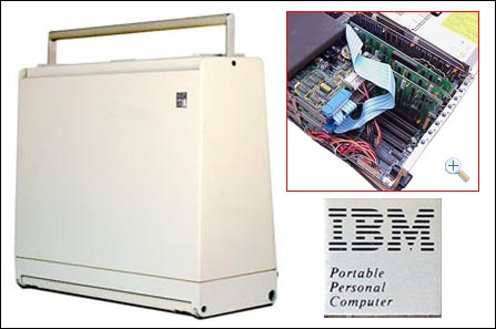1984年2月,IBM公司发布IBM 5155个人便携电脑。这款便携电脑采用的CPU是Intel 8088 (4.77MHz),配备256K的内存(最大扩充640K),内置显示器为9寸的琥珀黄色显示器,分辨率为640 X 200。这款便携电脑,的储存媒介为2个5.25寸磁盘驱动器,容量为360K。采用的系统为装在磁盘上的IBM PC-DOS Version 2.10。