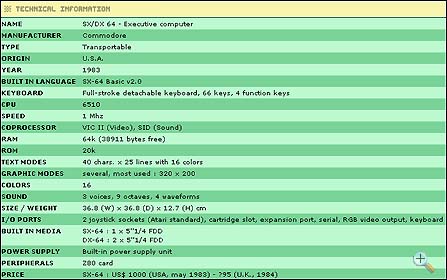 1983年5月,美国发布了世界首款彩色便携电脑,Commodore SX-64 "Executive"。这款便携电脑采用的是MOS 6510(1MHz)处理器,64K内存,320 X 200分辨率的5寸彩色显示器。虽然说是彩色,但是实际上最多只有16种颜色。还内置了5.25寸170K的软驱一个。从图中我们可以看到,实际上这款便携电脑还预留了一个扩展口,用来接第二款软驱其它设备。其实它的另一个型号DX-64就提供了两个软驱,不过该型号只限于国防内部使用,从未在市面上销售。