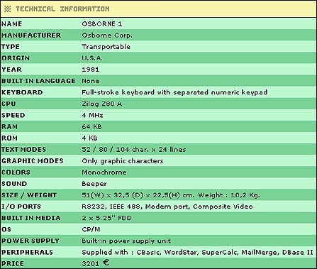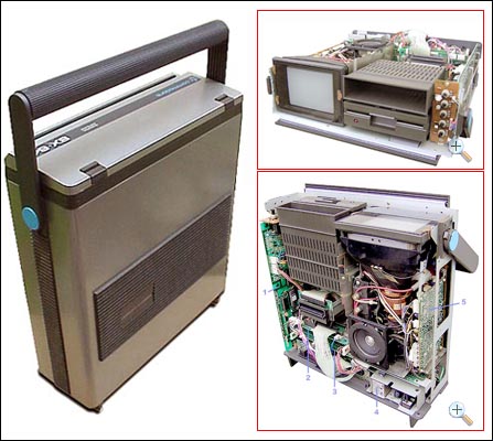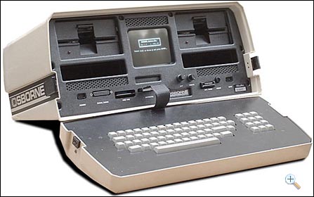 1981年4月,Osborne公司发布了一款名被Osborne 1的便携电脑。这款便携电脑比上面提及的HX-20发布得更早,又有些人将其称为世界上首款真正的便携式电脑。它采用的是Ziolog Z80A(4MHz)微处理器,配备了64K的大容量内存,5寸的黑白显示器。这款便携电脑还内置了两个5.25寸软驱、Moden,另外配备了外接电池组(需要选购),使得这款电脑能够有更强大的移动性。这款便携电脑的整体重量为10.2公斤。