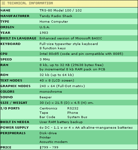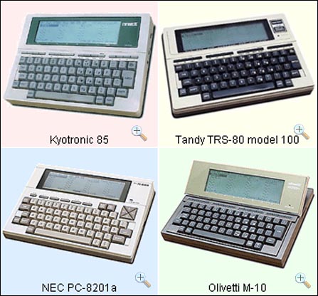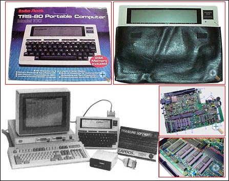 1983年,这款TRS-80 Model上市零售。这款电脑看起来有些像现在的计算器,不过在当时,它已经非常的轻便、强大。这款膝上电脑,采用了Intel CMOS 80C85(3MHz)处理器,配备内存为8K(最大32K),240 X 64分辨率的黑白液晶显示器。这款便携电脑在当时非常的精致整体重量只有3.8磅,约为1.7公斤。而且值得一提的是它采用的能源供应为标准的AA电池,当然也可以外接电源使用。