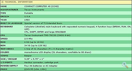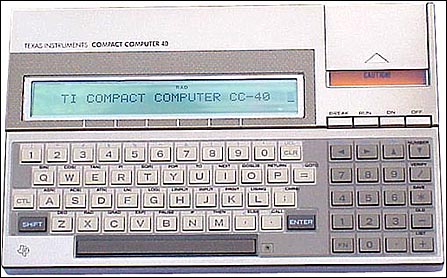 1983年3月,由Texas Instruments(TI)研发的TI CC-40便携电脑问世。这款便携电脑采用的是TI公司自己研制的70C20 (2.5MHz)处理器,6K-18K的内存,单色液晶显示器。这款便携电脑在当时的绝对优势在于,重量只有600g,采用4颗AA电池供电的时候能够持续运行200个小时!