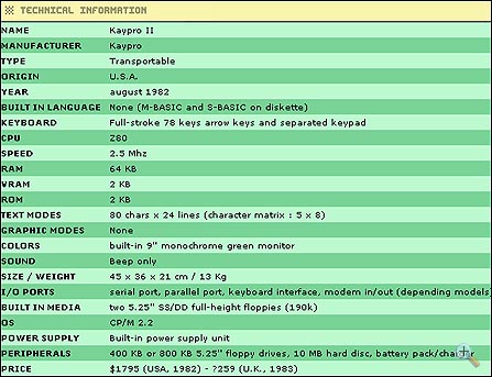 1982年8月,Non-Linear Systems发布了他们自行研制的第一款便携式计算机,Kaypro II。这个公司前身一直从事航天飞机上的便携电子设备的制造,领头人Andy Kay是数字式万用表的发明人。这款便携电脑值得一提的是,它是当时世界上第一款采用金属外壳的便携电脑。这款电脑的配置为Zilog Z80(2.5 MHz)处理器,64K内存,内置9寸绿色显示器。机器配备了两个5.25寸支持190K容量的软驱,而且该款电脑还拥有外接电池和硬盘(10MB)选购,整体重量为13公斤。