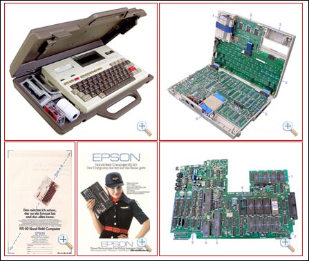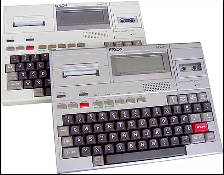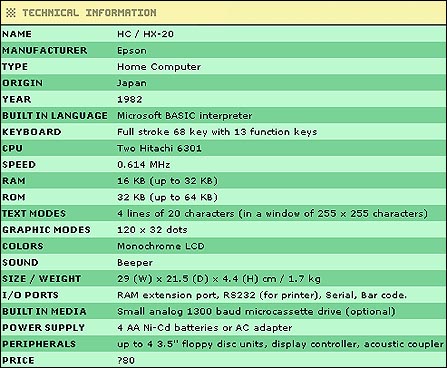 1982年到1981年间,Epson公司发布了这款HX-20便携电脑。这款电脑在当时可以称得上是惊世之作。有的书籍认为它是首款真正意义上的便携计算机。在当时,这款计算机是唯一集成了磁带驱动器、迷你打印机和液晶显示并且使用内置镍镉电池运行的便携设备。这款便携电脑的配备了两颗Hitachi 6301(0.614MHz)处理器,内存为16K(最大支持32K),配备120 X 32分辨率的单色液晶显示器。这款便携电脑的整机重量为1.7公斤,在当时来说已经相当的轻便了。 而且内置电池的供电能够让这款电脑持续运行50小时。