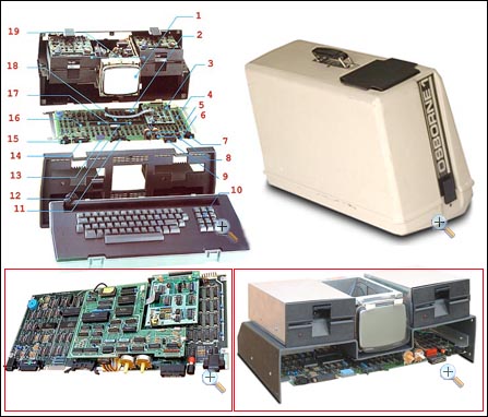 当时这款便携电脑拥有其专有的公文箱装载。为了让大家了解其内部的构造,这里笔者还是找到了它的内部拆解图,我们可以从图中很明显地看到这款电脑之所有能做到如此的袖珍完全是在设计上合理布局。通过电池位置的合理纳入,让主板在狭缝中找到容纳之所。当然这也跟当时电脑的发热量有关系,毕竟不用考虑热量的因素。这或许是世界上第一款采用内置电池驱动的便携电脑(笔记本电脑)。