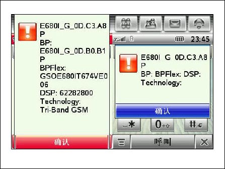 同样是一款大家耳熟能详地机型,320×240象素的顶极屏幕,细腻程度无以伦比,配合2.4英寸的宽大屏幕,看起电影那叫一个过瘾!这里笔者要提醒大家,现在市场上有一些标价2500左右的E680i出售,其实据笔者了解这种E680i都是由E680刷上去的,为了,让大家在购买的时候有一个清晰的辨别,这里我提供给大家一个鉴别的方法:在拨号盘界面输入“WWW008W”(其中W可以用“插入-插入等待”来实现),在下图中,左边是E680i行货版本显示的信息,而右边则是E680刷成E680i后显示的信息,这样大家一眼就能辨出真假!