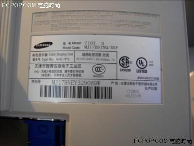 在三星710T背部的铭牌简单地标有显示器的相关标识和序列号,这款显示器由三星的天津生产线生产。