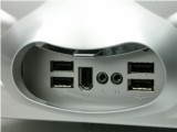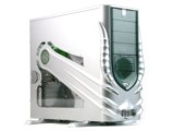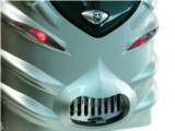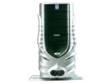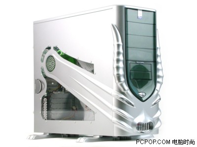 正面看去两只牛角分立在前面板两侧,而中间夹着的是驱动器舱位,中间那个骷髅头造型的按钮则是电源开关。前置I/O采用了USB2.0×4、Audio×2、1394的设计,满足用户各种需求。透明侧板上也设计有一个CPU通风孔。