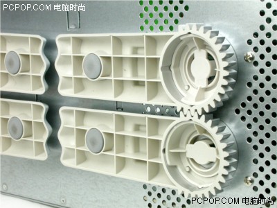 再来看看四只“牛脚”的设计,可以看它们两两采用了齿轮咬合的方式,只要转动其中一个就可以带动另一个,并且长度很大,全部张开后想推到机箱都难。