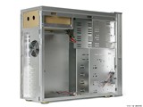 内部设计上,“海王星”做得相当干净。边角方面虽然有的地方没有进行折边处理,但精细的做工依然有效避免了尖锐边缘的出现。为了方便主板的安装,“海王星”特意将固定主板的托盘设计成可抽拉式。扩展性能上,“海王星”提供了4个光驱扩展位、2个软驱扩展位和4个硬盘扩展位。
