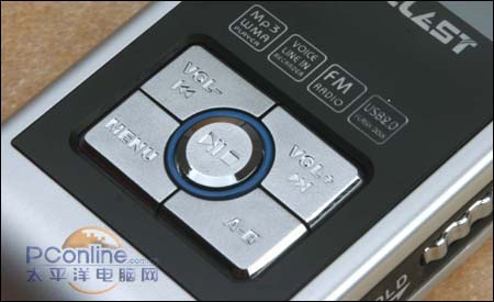 台电这款MP3的综合素质很均衡,造型简洁大方。机身很轻巧,厚度仅13mm,放在任何一个口袋里都几乎没有感觉。G808和魅族E2一样也是金属外壳,使用铝镁合金材质,而且做了拉丝处理,虽然价格不高,但整机显得精致而有品位。正面5个按键的设计也富有男性气息。