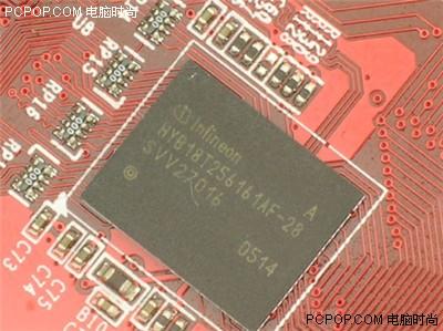 显卡采用了市面上比较少见的-2.8ns的DDR2的显存,使得整块显示卡在数据处理和GPU和显存交换上得分有了大幅度的提高。电气性能更加优越、发热量更加小、频率更高、速度更快的DDR2显存可以大幅提升显卡的超频潜力。正反两面各四颗16*16的显存,总共八颗,搭配成256M/128Bit的显存系统,核心频率和显存频率分别为450/700MHz,应该还有相当大的超频空间。