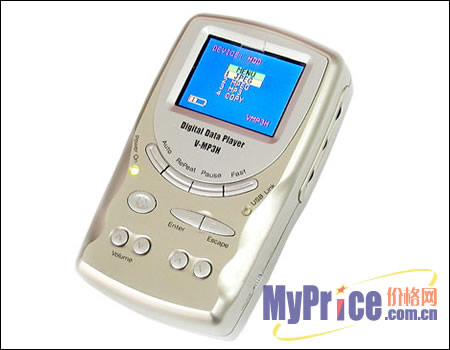 V-MP3H在功能上的表现与旅之星 AV-1000比较相似,它有支持MP3播放,影片放映,照片浏览和影像录制四大功能,使用者可以通过CF卡、SD/MMC卡或者Microdrive来扩充内存,V-MP3H机身上的众多按键主要用于控制MP3播放。