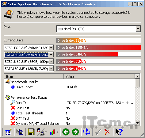 由这个图大家可以看到,SCSI RAID 0系统性能大幅领先于SATA RAID 0,而SATA RAID 0也是大幅领先于单SCSI系统,不过比较意外的是这款15000转的希捷U320 SCSI硬盘输给了同样单碟容量但是转速只有10000转而且是U160的SCSI硬盘,原因估计是在主板整合的SCSI控制器上,我们相信SIS在测试时采用的是ADAPTEC的SCSI控制器,而主板上整合的是LSI的控制器。不过回过头来再看,这款服务器的SCSI系统还是比具备更大单碟容量的SATA150磁盘要强一些。