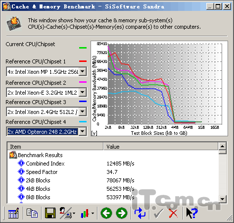 我们测试的这款服务器是上图中的绿线,它的成绩比双路NOCONA 3.2G稍弱一些,因此属于正常水平。
