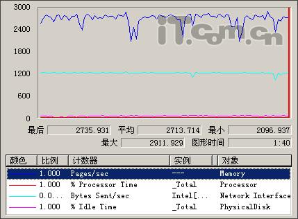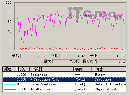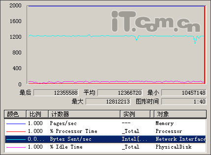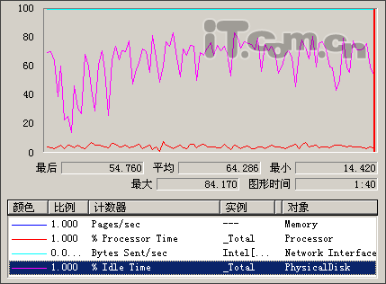 由于只有100Mb的网络连接,因此数据传输满载时瓶颈也是在网络这边,作为一款SCSI硬盘还是可以轻松应付的,平均的磁盘空闲时间是64.286%,不过磁盘使用率最高的时候曾达到85.58%。