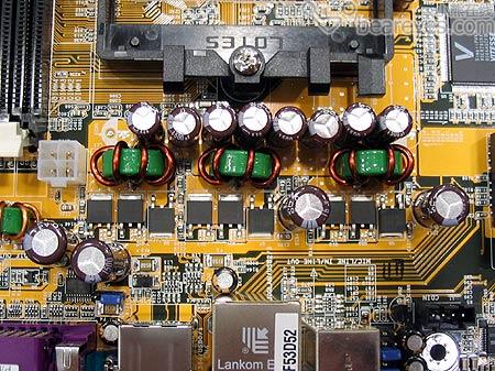 供电方面,这款主板依旧秉承了DFI产品一贯严谨、扎实的设计,其不但采用了成熟的三相回路供电电路,并且还辅以多颗大容量高品质的KZG直立式电解电容,确保整机日后系统的稳定性还是没有问题的。