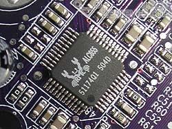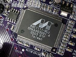 功能方面,这款主板集成了ALC655音频芯片,能够提供六声道音效输出功能。同时它还板载了Marvell 88E1111-RCJ千兆以太网控制芯片,并内建防火墙功能。