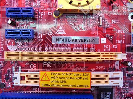 此款主板可以支持PCIe X16和AGP两种规格的显示卡,其中,AGP接口,BIOSTAR称为XGP接口,是Xtreme Graphic Port的简称,虽然是AGP的物理接口,但是内部总线仍然是启用PCI总线,占用了双PCI带宽的XGP在位宽以及运行频率上,相比传统的AGP接口会有明显的不足。