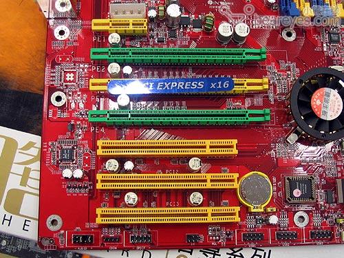 值得关注的是,这款主板采用了全球首创的“魔力32X”技术,此技术将原本设计在两条PCI Express x16插槽之间的sli/normal跳线替换成了一条黄色的PCI Express x16插槽,换句话说,也就是这款主板上居然出现了三条PCI Express x16插槽。不过它的工作原理与传统的SLI主板还是基本一致的,其中2根绿色插槽是用于组建SLi功能的PCI Express x8插槽,黄色的插槽则是真正的PCI Express x16插槽,能够提供单卡的高速运行需求。