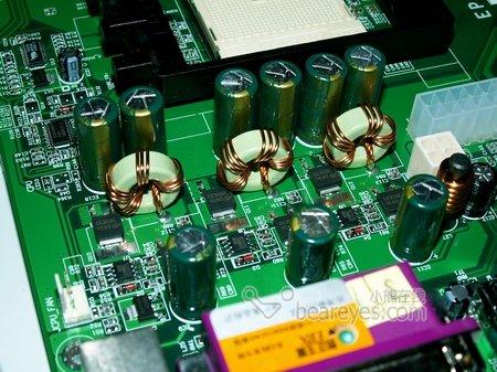 供电方面,这款主板采用了扎实的三相回路供电设计,并选用了不少日系Sanyo高品质电容,给予CPU有效的动力支持。