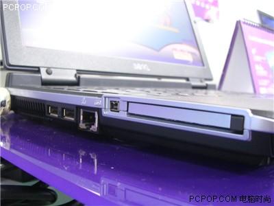 接口:S52E的大部分的接口都集中在了机身的左侧,在最前面是S52的散热出口、两个USB 2.0、10/100 网卡接口,1394小口、PC卡插槽。而在在机身正面,从左到右,分布着扬声器(左)、红外、无线\蓝牙开关、耳机、麦克插口、五合一读卡器(SD、MMC、MS、MS Pro、XD)、扬声器(右)。
