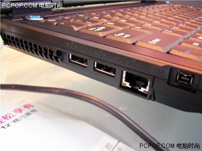 接口:机身左边,集中了2个USB、1个1394、一个网卡接口以及PCMCIA插槽,右边安排了VGA、MODEM接口以及COMBO光驱,背部有S端口、电源接口以及一个USB接口。总体来说接口安排的比较合理,方便使用。红外接口安排在机身前端,十分方便用户使用红外设备与笔记本进行数据传输,另外在机身前端的还有音频接口、读卡器、无线网卡的指示灯。
