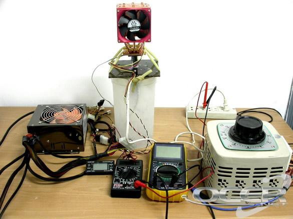 由于本次测试针对的是低端产品,主要针对赛扬D、Sempron一类的CPU,它们的平均功率一般为80W左右。因此我们将接触式调压器输入电压锁定在150V,此时通过万用表测得测得输入电流为0.56A。因此可知,发热源的功率近似为84W,与低端CPU相仿。