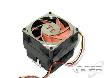 火山7A是Tt为AMD Athlon XP系列处理器量身订做的一款静音散热器。这款散热器最大的特点是底部采用了铜铝结合的技术,铜底与铝制散热片之间通过银膏填充,紧密结合;铜底采用了盘铣,表面十分光滑;相比传统的纯铝制散热器,这种设计在成本和性能之间有了折中,所以更具优势。原配的8025风扇转数为2400RPM,噪音仅为26dBA,风量达到了38.4CFM,适合喜爱静音的用户使用。火山7A使用了标准的Socket 462扣具,拆装都比较方便。