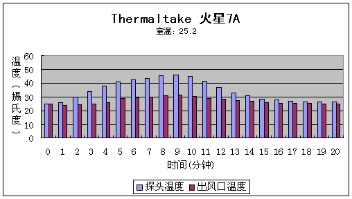 Tt火山7A标称支持Athlon XP 3000+处理器,实际测试中,它能够将84W的发热源温度控制在45度左右,作为一款超静音散热器,这样的表现还是不错的。
