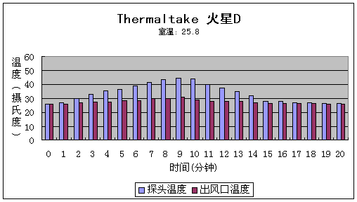 由于是一款面向高发热量处理器的产品,火星D在84W热源上的散热性能显得中规中距,整个测试过程中的温度一致维持在45度以下。同时,在温度下降阶段表现出铝质散热器的典型特征:降温速度迅速。