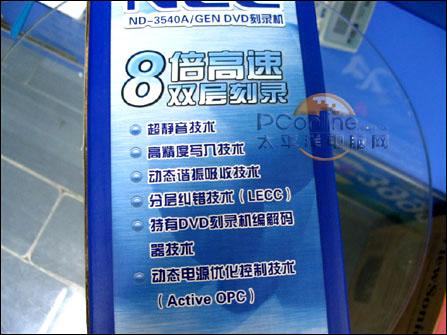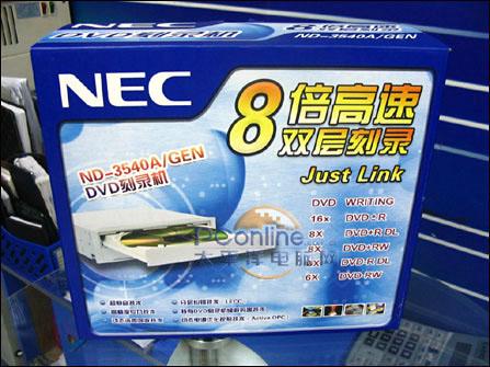 市面上全线双16X刻录机都降到499元的公开价位,NEC的当然也不例外,前不久NEC的一款 3520A DVD刻录机报价499元,而最近NEC的一款支持8倍高速双层刻录的NEC ND-3540A/GEN也仅卖599元。