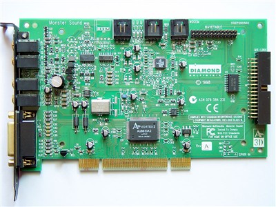 MX300是Diamond继MX200之后生产的Monster系列声卡,虽然外表看上去MX300并没有MX200豪华。但是MX300最大的特点是采用了当时Aureal最新的8830音效芯片。相比S90所采用的8820芯片,8830则在软件上支持A3D2.0,同时支持更逼真的4.1音箱环境定位,绝对是当年游戏爱好者最梦寐以求的一张声卡……