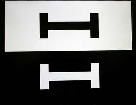 CheckScreen的Crosstalk测试主要考验液晶自身的抗干扰能力,打开这两个图像后,仔细观察“I”的周围是否受到干扰。即黑色“I”周围的白色是否显得黯淡,白色“I”周围的黑色是否显得比较亮。