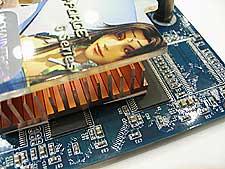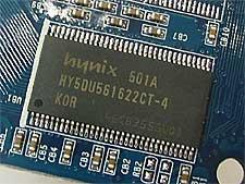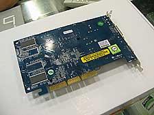 显存方面选用了韩国现代4纳秒颗粒,正反合计4枚,构架出64bit 128MB的容量,默认工作频率500MHz。显存布局比较独特,显存颗粒没有采用单枚正反镶嵌方式,在正面预留的4颗空焊点中,选择了中间2、3的位置,而且被散热器覆盖了一部分。背面选择了1、4的位置,间距很大。