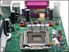 与此同时,我们也收到一块来自Intel自家的主板,Intel主板一向以稳定著称,这块主板的型号是D945GTP,从图片上我们可以看到,厚实的MicroATX小板设计,用料颇为豪华,做工十分精细,墨绿色PCB板上的元器件星罗密布,让人看一眼就觉得它真材实料。
