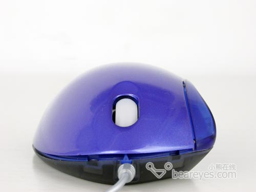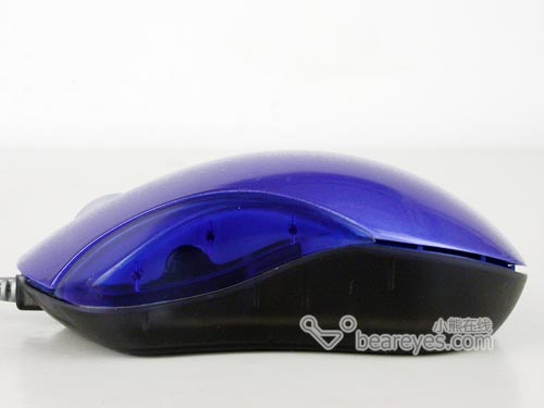 “花瓣雨”的外型设计比较另类,采用的是人体工程学设计,鼠标表明经过了UV处理,较为独特的是在连接电脑后,在拇指的凹槽处会发出兰色的光,在夜晚使用的时候会很好看。 并且鼠标采用深蓝色的颜色,使“花瓣雨”看起来更加诱人。
