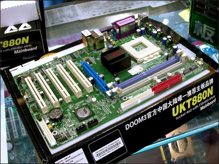 双敏UKT880N采用的是VIA KT880+VT8237芯片组。三相供电以及电路中固态电容的采用,使这款主板的最大特色。在这部分用料上要比前面的七彩虹NF400U MAX主板好。主板同样也提供了对S-ATA的支持。