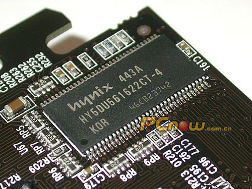 显存部分,由8颗现代4ns显存颗粒构成,容量为256MB,位宽128bit。显存速度较慢不得不说是个遗憾,不过256MB的容量和799价格应该可以让人理解了。