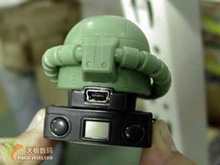 这款绿色 ZAKU Ⅱ数码相机真的好有意思,充满了童趣味道,不过经的性能似乎比较不良哦,只采用 30 万像素、分辨率 640*480 的 CMOS 镜头,使用 USB 接口与电脑连接,可最多也只能拍摄 78 张图片或 15 秒的录象,使用 3 节电池。
